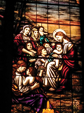 There, up front, the stained glass window that catches my eye these days is a large one depicting Jesus embracing the little children.