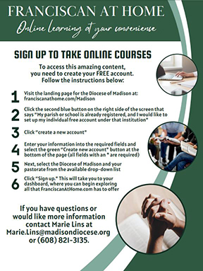 Franciscan at Home and all tracks available on the online learning system are now available to anyone in our diocese as a way for catechists and parishioners to grow in faith and in love for Christ!